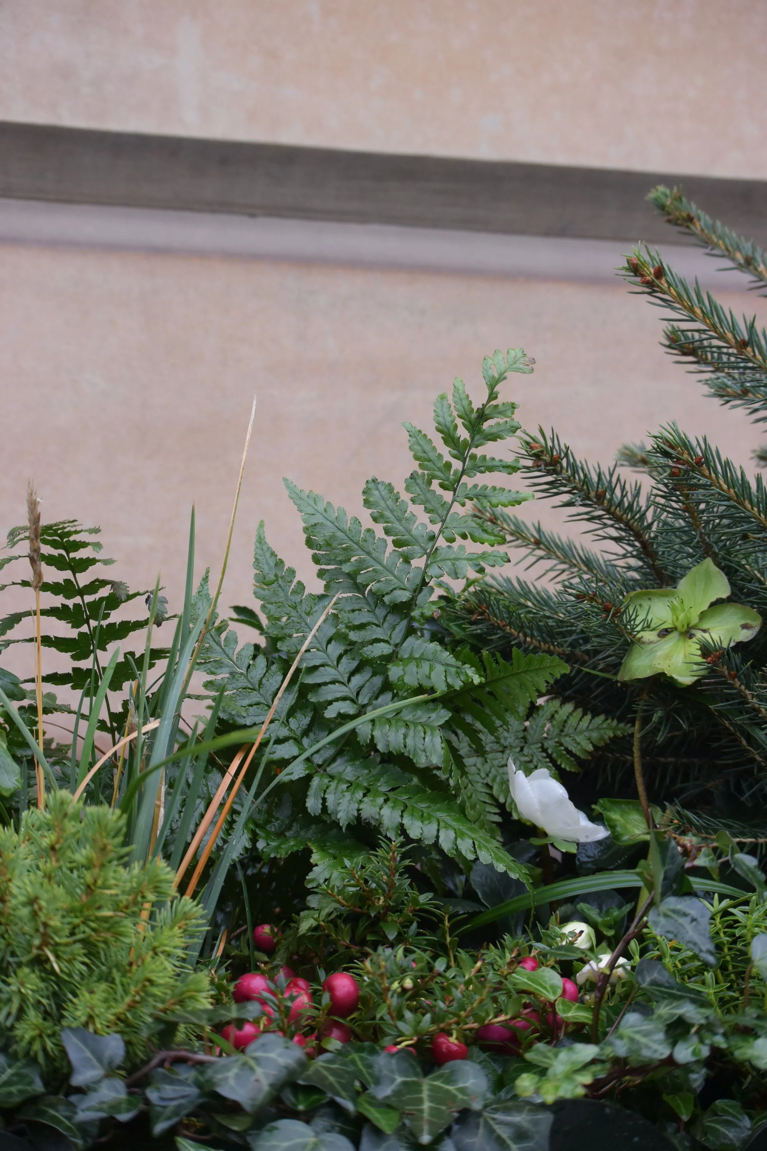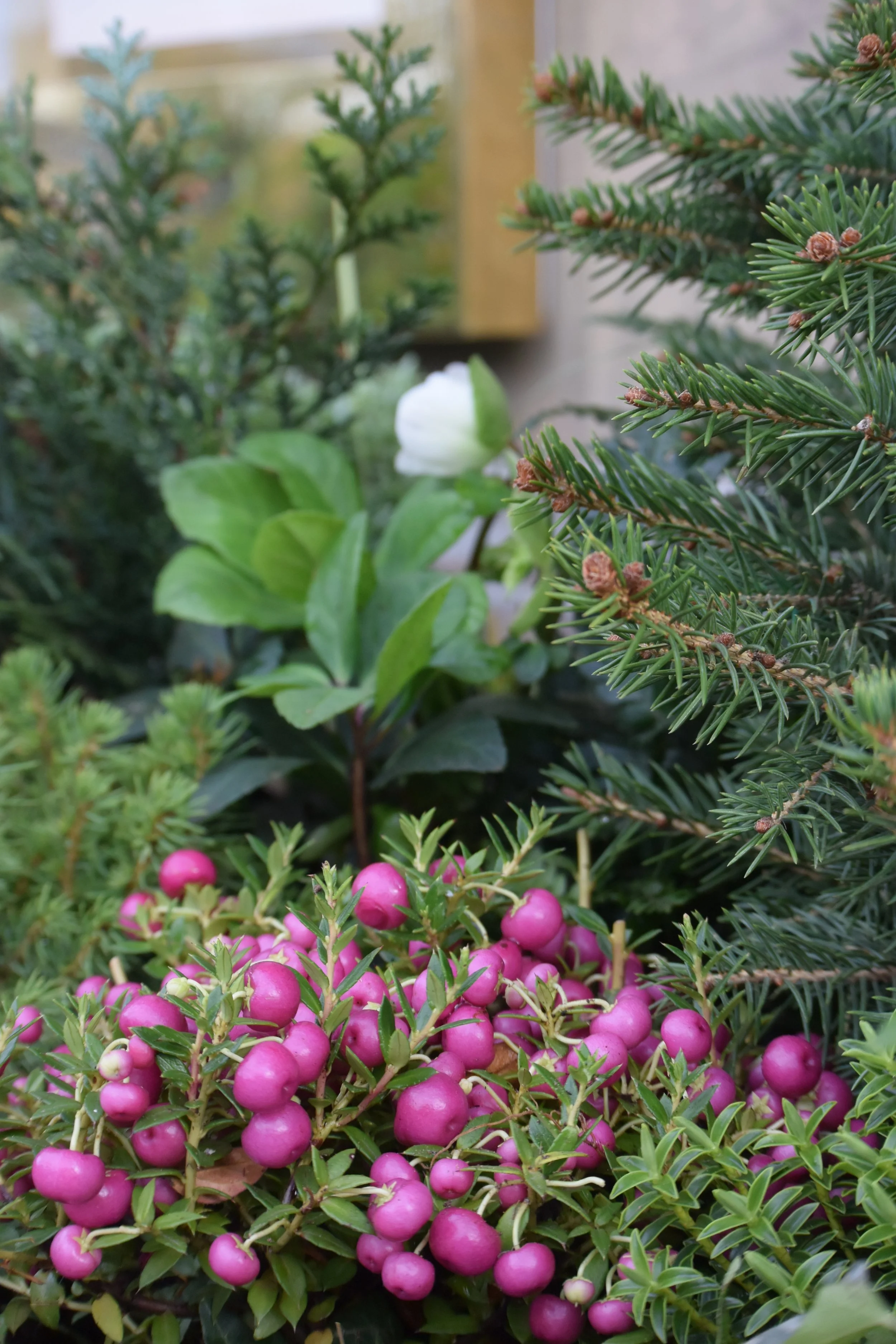 A beautiful pop of pink and red colour was achieved by planting Gaultheria (Checkerberry) and Pernettya (Prickly heath), both produce small, round berries.
