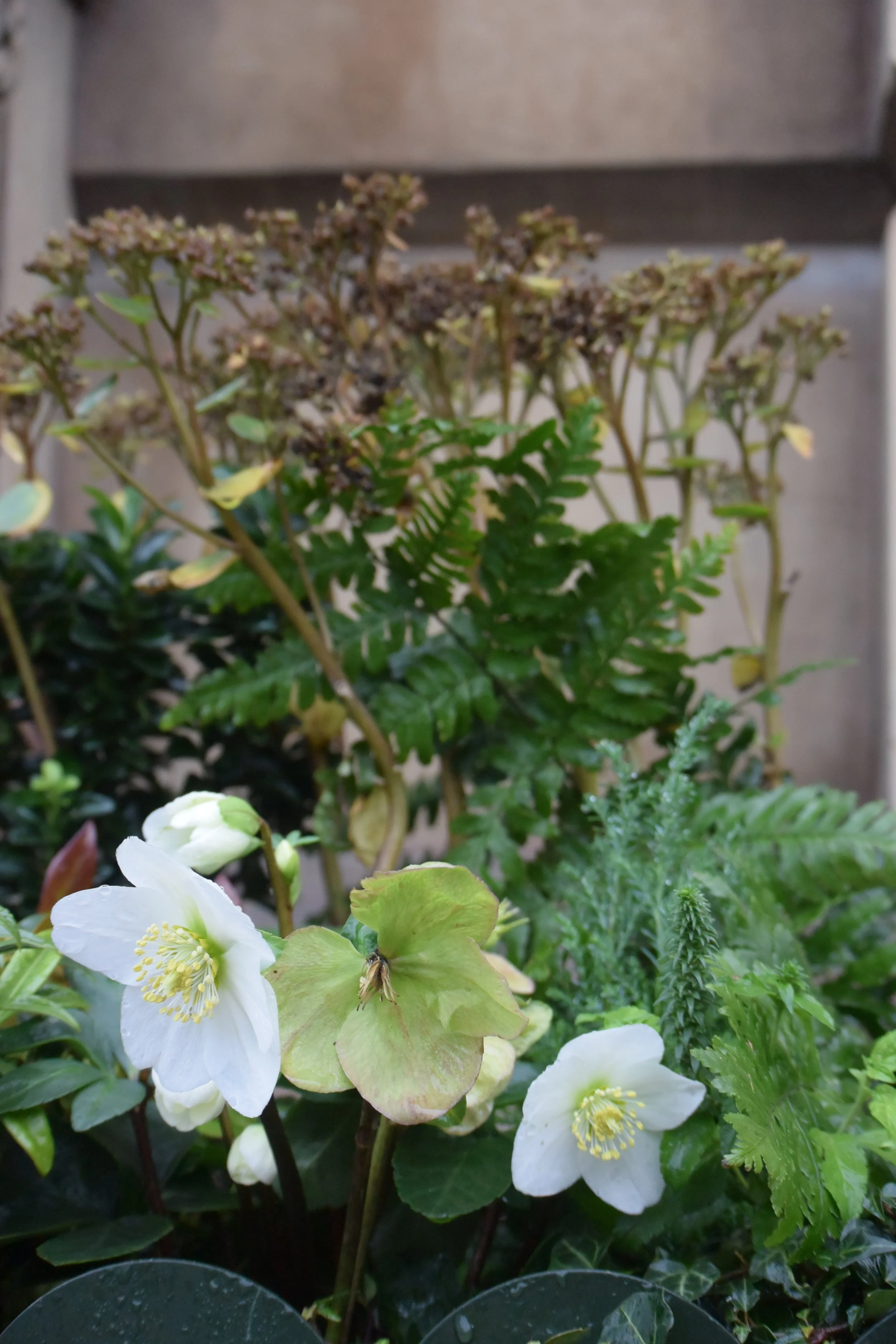 What is fascinating about the Hellebore plant is that the flowers go through a very elegant and subtle transition - the white petals turn gently green. They do not darken or turn brown. It was an important element when thinking about the planting design for this project.